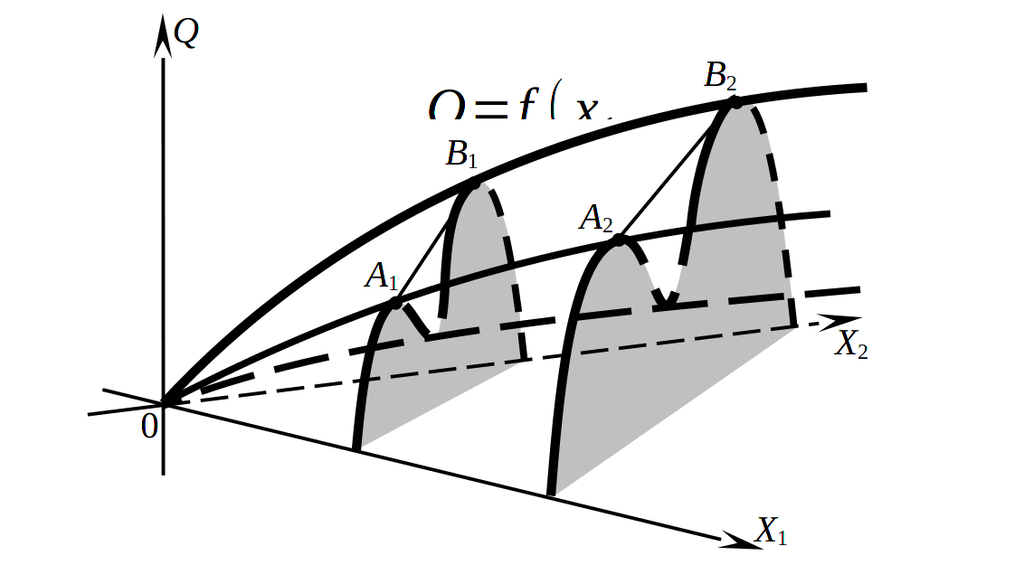 Итак, квазивогнутой является функция, у которой подграфик (технологическое множество) является выпуклым в любом своем горизонтальном сечении. Другими словами, квазивогнутой является функция, вогнутая в любом своем горизонтальном сечении. Следовательно, Функция является квазивогнутой тогда и только тогда, когда ее второй дифференциал неположителен вдоль произвольной линии уровня: