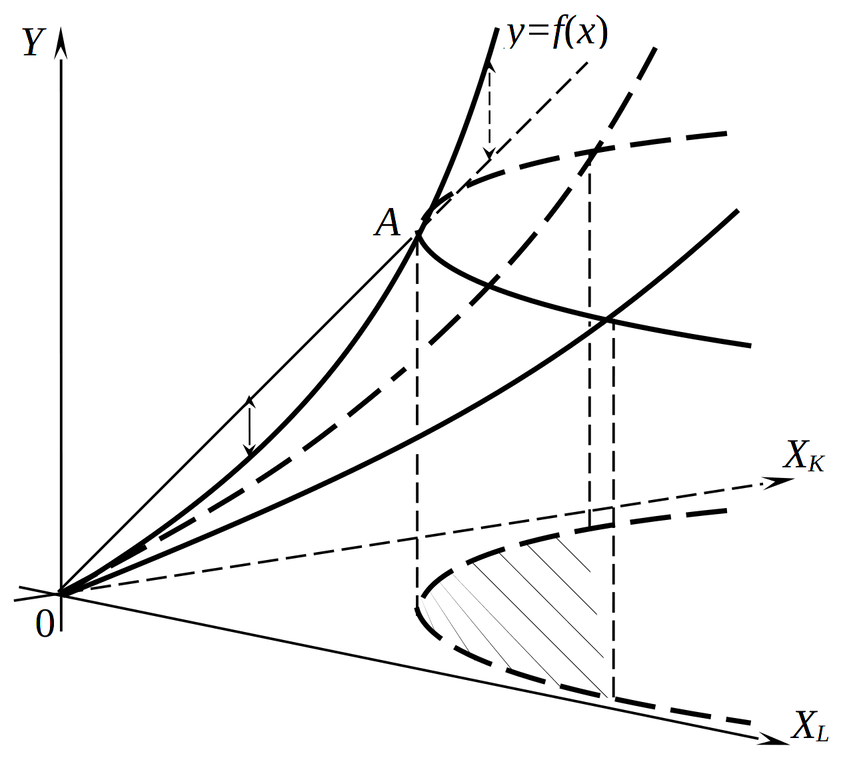 В случае если производственная функция \(f:R_{{+ {}^{2}}\rightarrow R_{+}}\) дважды непрерывно дифференцируема \(\), необходимое и достаточное условие ее строгой вогнутости будет заключаться в том, что при любых \(\xi_{K}\), \(\xi_{L}\) и допустимых \(x_{K}\), \(x_{L}\) соответствующая квадратичная форма отрицательна: