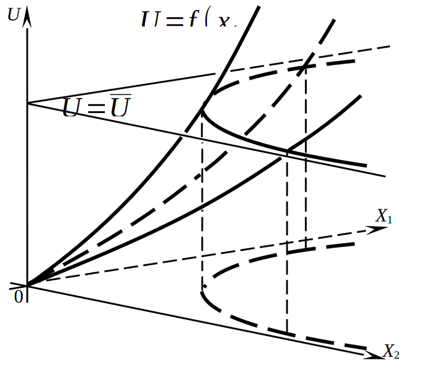 Таким образом, функция \(f:X\rightarrow R\), где в рамках нашего анализа X – выпуклое подмножество \(R_{+ {}^{l}}\), является строго квазивогнутой, если для любых двух различных точек \(x_{1}\neq x_{2}\in X\) таких, что \(f\left( x_{1} \right)\geq q\), \(f\left( x_{2} \right)\geq q\) при произвольном \(q\in R\) для любой внутренней точки соединяющего их отрезка \({x = \lambda}{x_{1} + \left( {1 - \lambda} \right)}x_{2}\) выполняется неравенство \(f{(x) \gt q}\), то есть