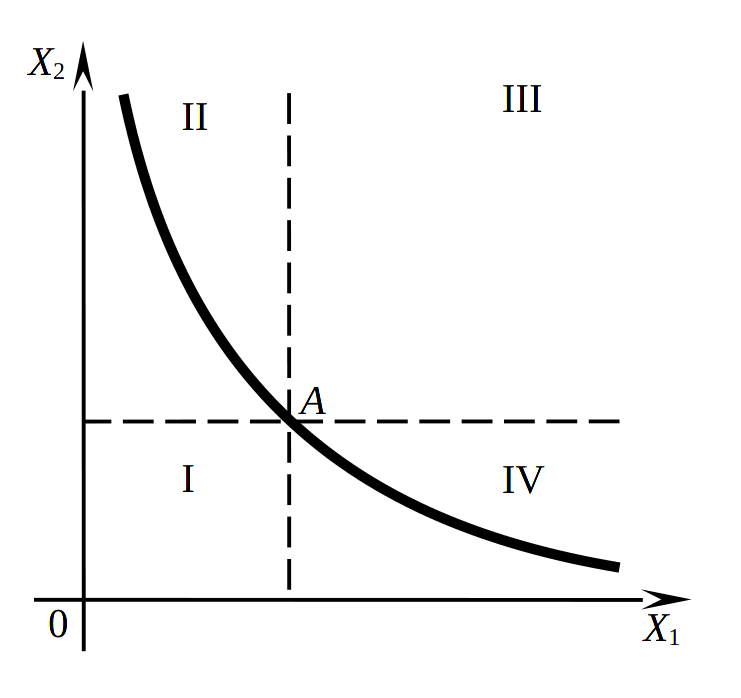 Вследствие предположения о ненасыщении кривая безразличия, расположенная дальше от нуля (в положительном ортанте), соответствует более высокому уровню потребительского удовлетворения. Поэтому на рис. 1.8 корзины, эквивалентные A, с точки зрения данного потребителя, располагаются либо во II, либо в IV квадрантах. Следовательно, кривая безразличия – это убывающая зависимость объемов потребления одного из товаров \(x_{2}\) от количества потребляемого другого блага \(x_{1}\).
