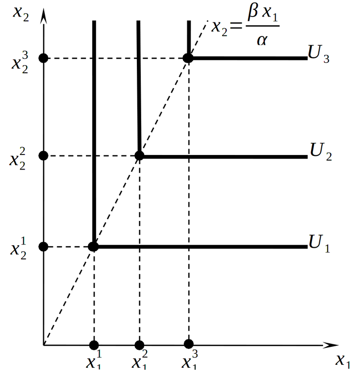 Линии безразличия для совершенных комплементов имеют вид прямых углов (рис. 1.9, 1.10) с вершинами в точках, характеризующихся равенством \(\frac{x_{1}}{\alpha} = \frac{x_{2}}{\beta}\), или: