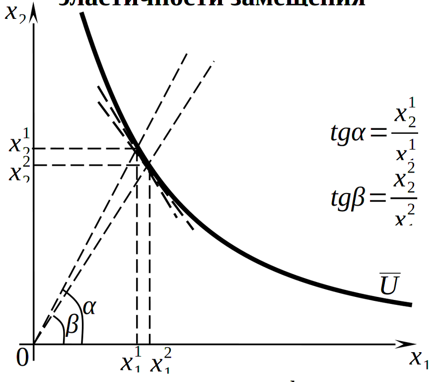 Графически соотношение между объемами потребляемых продуктов характеризуется тангенсом угла наклона луча, исходящего из начала координат и проведенного через данную точку пространства потребительских благ, которая будет располагаться на некоторой кривой безразличия. Соответственно, эластичности замещения показывает, насколько в относительном, процентном выражении должен измениться угловой коэффициент данного луча при его повороте, вызванном перемещением в новую точку на той же кривой безразличия, соответствующей единичному относительному, процентному изменению предельной нормы замещения, т.е. тангенса угла наклона касательной к данной кривой безразличия (рис. 1.13).