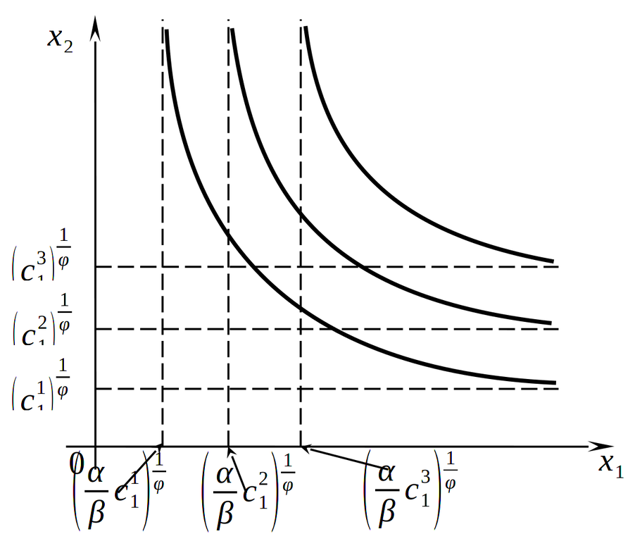 Из выражения кривой безразличия (1.33) видно, что, поскольку \({x_{1} = \left( {\frac{- \beta}{\alpha}{x_{2}^{\varphi} + c_{1}}} \right)}^{1/\varphi}\), \(x_{2} = \left( {\frac{- \beta}{\alpha}{x_{1}^{\varphi} + \frac{\alpha}{\beta}}c_{1}} \right)^{1/\varphi}\), при \(\rho \gt 0\) кривые безразличия имеют асимптоты: \({\lim\limits_{x_{2}{\rightarrow + \infty}}x_{1}} = c_{1}^{1/\varphi}\), \({\lim\limits_{x_{1}{\rightarrow + \infty}}x_{2}} = \left( {\frac{\alpha}{\beta}c_{1}} \right)^{1/\varphi}\) (рис. 1.14).