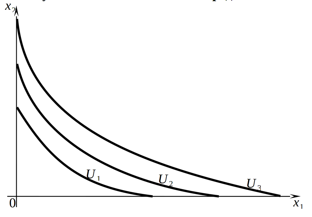 При этом действует свойство ненасыщаемости потребления, поэтому линия безразличия, более удаленная от начала координат, соответствует более высокому уровню полезности (\(U_{3} \gt U_{2} \gt U_{1}\) на рис. 1.12).