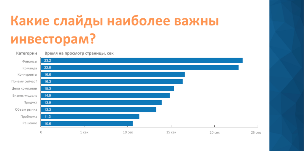 В исследовании компании DocSend и профессора Гарвардской школы бизнеса Тома Эйсенманна, проведенном на базе 200 презентаций стартапов, которые суммарно привлекли около 360 млн долларов1, было определено, что компаниям, в среднем, требуется около 40 встреч с инвесторами и чуть более 12 недель на то, чтобы успешно завершить процесс посевного инвестирования. При этом инвесторы просматривают презентацию стартапа недолго — в среднем в течение 3 минут и 44 секунды.