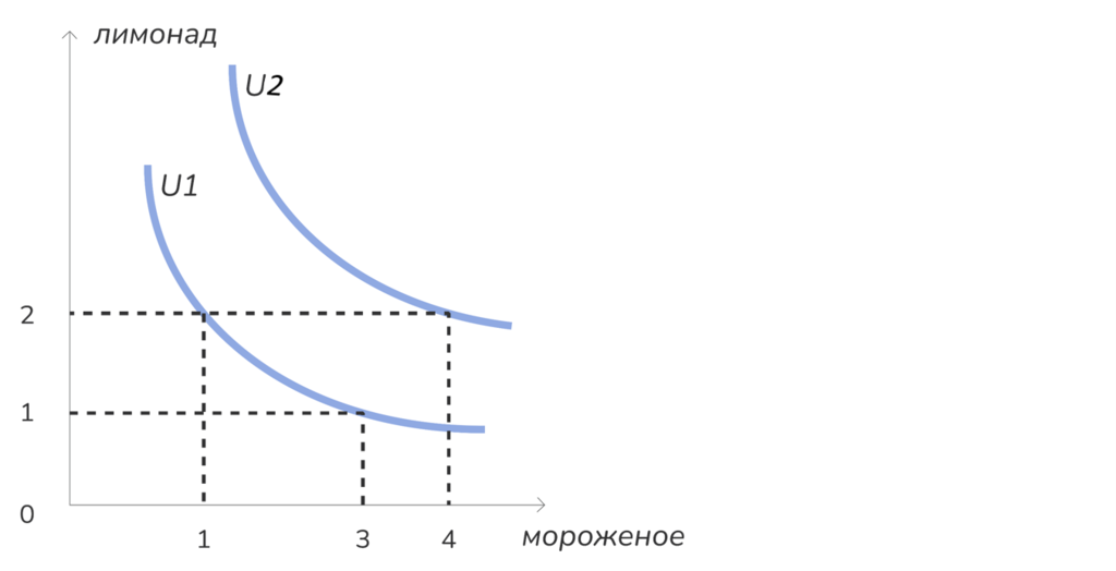 Одну и ту же общую полезность могут приносить разные сочетания товаров. Например, 1 лимонад и 3 шарика мороженного могут приносить такую же полезность U1, как 2 лимонада и 1 шарик мороженого. Если отметить на координатной плоскости все такие комбинации двух товаров, которые приносят одинаковый уровень полезности, то получится кривая безразличия покупателя. Как правило, чем больше товаров входят в набор, тем большему уровню полезности он соответствует. Так 2 лимонада и 4 шарика мороженного принесут большую полезность, поэтому должны находиться на более высокой кривой U2. (рис. 2.14) Идея ранжировать товары между собой, в меньшей степени опираясь на количественное значение полезности, относится к ординалистской теории полезности.