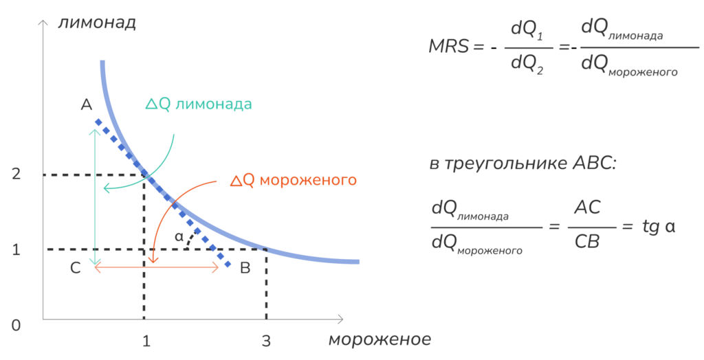По кривой безразличия можно рассчитать предельную норму замещения одного товара другим (MRS, marginal rate of substitution), то есть то количество товара 1, от которого можно отказаться взамен на одну единицу товара 2.