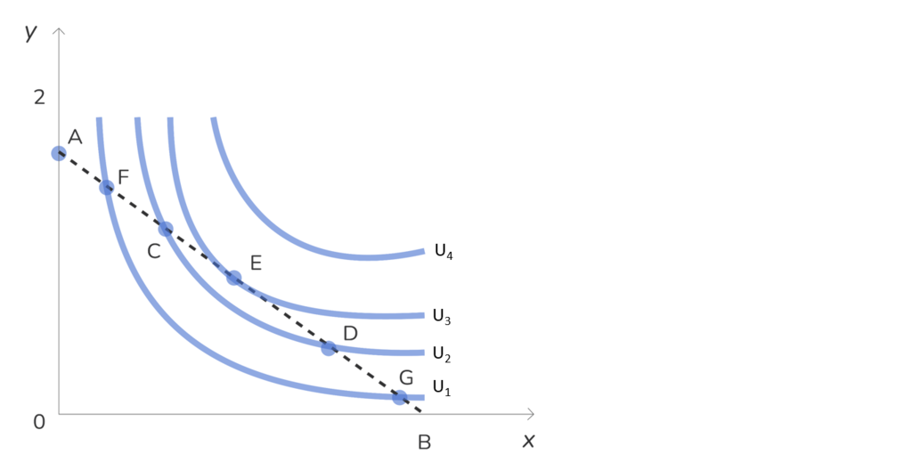 На рисунке 2.19 линия U1 пересекается с бюджетным ограничением АВ. Все точки, которые лежат на бюджетном ограничении и ниже него потребитель может позволить себе купить. Но если сдвинуть кривую безразличия до U2, общая полезность потребителя увеличится, хотя всё ещё будет набор комбинаций, которые потребитель может купить. Там мы можем сдвигать кривую безразличия до уровня U3. У этой кривой есть всего одна комбинация, которую потребитель может приобрести – это точка E. Эта точка и будет оптимальным решением потребителя в данном случае. Если мы попробуем увеличить общую полезность, то есть сдвинуть кривую безразличия вверх, то новая кривая уже не будет иметь пересечений с бюджетным ограничением, на покупку таких наборов потребителю не хватает денег. Если сдвигать кривую безразличия вниз – это приведет к снижению общей полезности, то есть новые точки окажутся для потребителя хуже. Таким образом, точка Е – лучшее из того, что может позволить себе потребитель при заданном бюджетном ограничении.