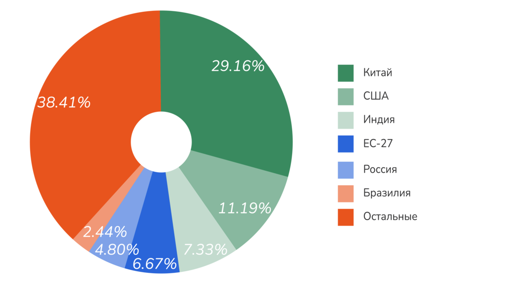 Наиболее существенно на климатическую систему планеты воздействуют экономики Китая, США и Индии; вместе они выбрасывают половину мировых эмиссий СО2 (Рисунок 1.4.1). Россия занимает четвертое место в мире по выбросам СО2 — 4,6%.