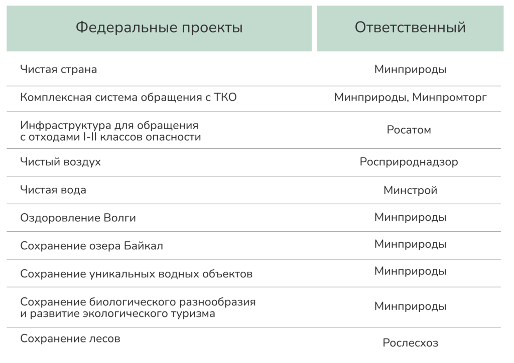 Важное значение для природы России имеет реализация национального проекта «Экология» (2018-2024), содержащего 10 федеральных проектов, связанных с уменьшением загрязнения окружающей среды и охраной важных природных объектов (река Волга, озеро Байкал и т. д.) (см. Рисунок 2.6.1).