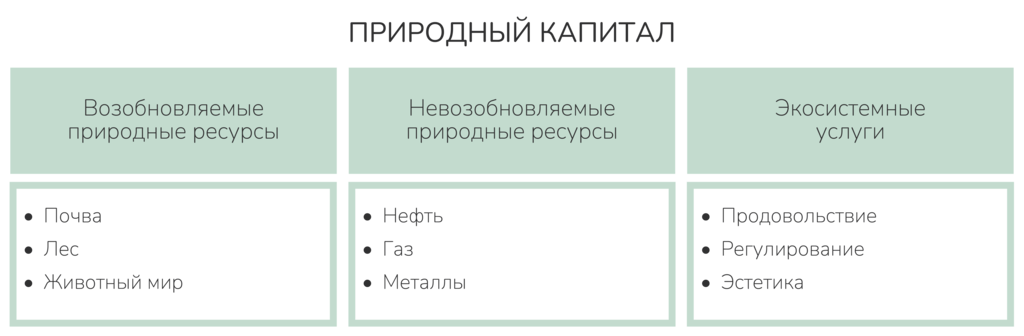 Также в литературе встречается дифференциация природного капитала на активный (или возобновимый) и пассивный. Активный капитал включает в себя способные к возобновлению экосистемы. Пассивный капитал – это невозобновимые природные ресурсы.