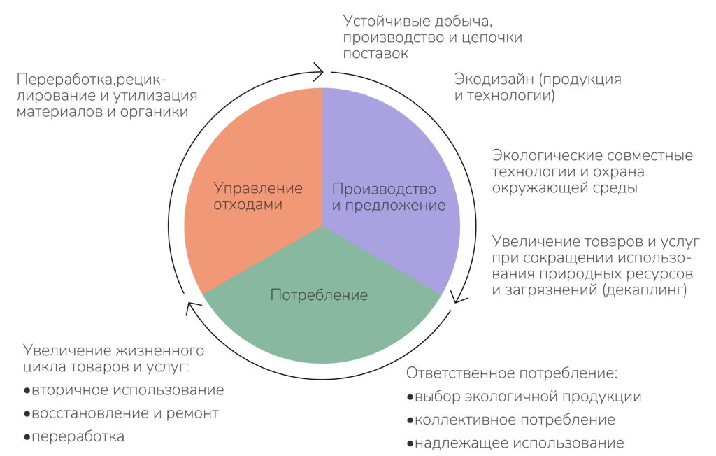 В литературе выделяются три ключевые особенности, присущие экономике замкнутого цикла: во-первых, усиленный контроль за запасами природных ресурсов и соблюдением устойчивого баланса возобновляемых ресурсов для сохранения и поддержания на неистощимом уровне природного капитала; во-вторых, оптимизация процессов потребления путем разработки и распространения продукции, комплектующих и материалов, отвечающих самому высокому уровню их повторного использования; в-третьих, выявление и предотвращение негативных экстерналий (внешних эффектов) текущей производственной деятельности с целью повышения эффективности экономической и экологической систем.
