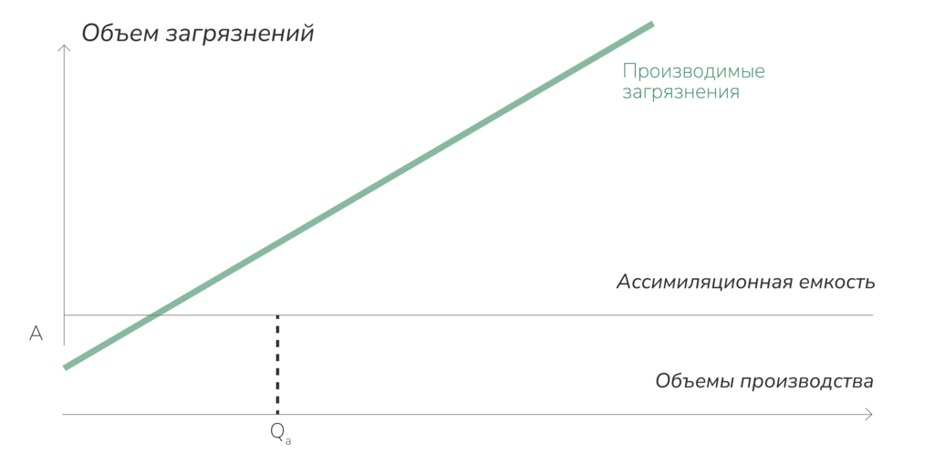 Однако при увеличении объемов производства свыше Qa и, соответственно, росте загрязнений более количества A, свыше ассимиляционной емкости природной среды возникают экстернальные издержки, налагаемые на общество.