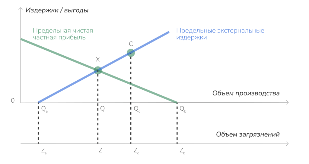 Экономический оптимум загрязнений достигается в точке Х, где пересекаются кривые 1 и 2. В этой точке предельная чистая прибыль производителя равна предельным экстернальным издержкам. При этом уровень производства равен Q, а уровень загрязнений — Z.