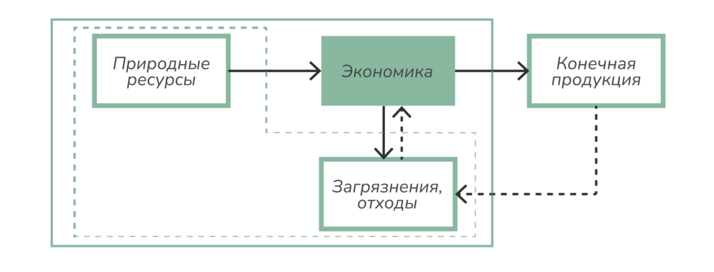 Если произведенной продукции не хватает, то, исходя из традиционной логики, очевидна необходимость подавать на вход больше природных ресурсов. При этом механизм функционирования «черного ящика» — экономики внутри — остается вне рамок рассмотрения. Борьба с загрязнениями окружающей среды, отходами, деградацией природных ресурсов на «выходе» экономики представляет собой, по существу, борьбу со следствиями техногенного экономического развития.